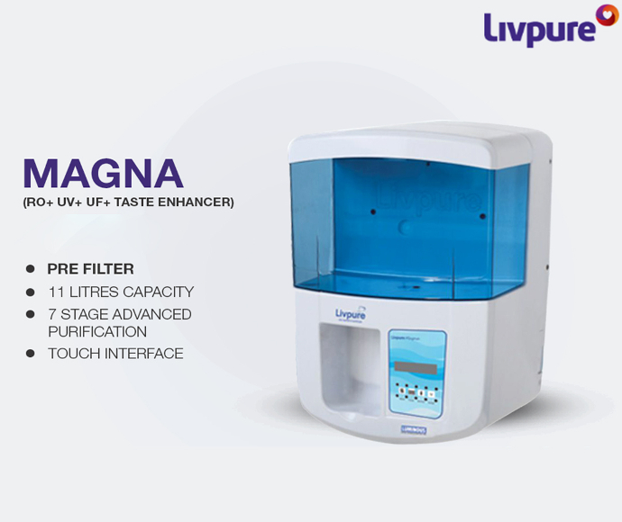 Livpure Magna maintains the freshness of water and reduces the growth of bacteria with RO+UV+UF+Taste Enhancer, ensuring pure water for your home every time.